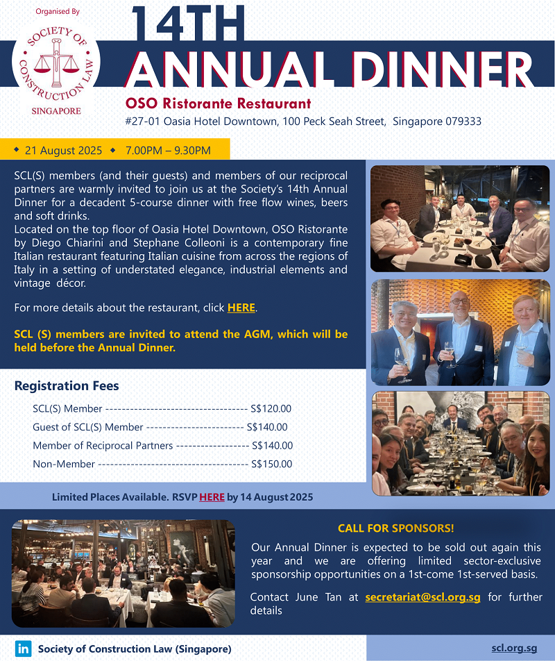 Country/Region Singapore Thursday, August 21, 2025 7.00-9.30pm (GMT +8) For more details and to register, please click HERE. Flyer SCLS_14_Annual_Dinner_21_August_2025.pdf